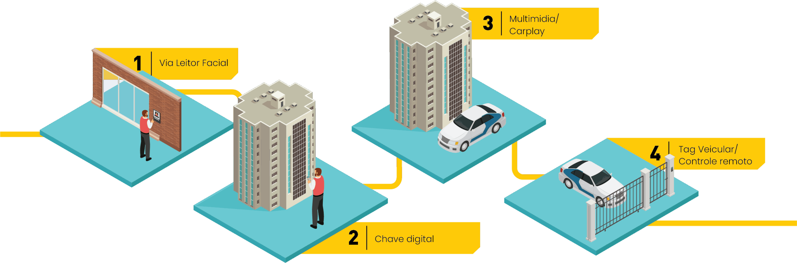 O acesso é feito por reconhecimento facial, aplicativo Emive, controle remoto ou tag veicular, com registro de todos os eventos.